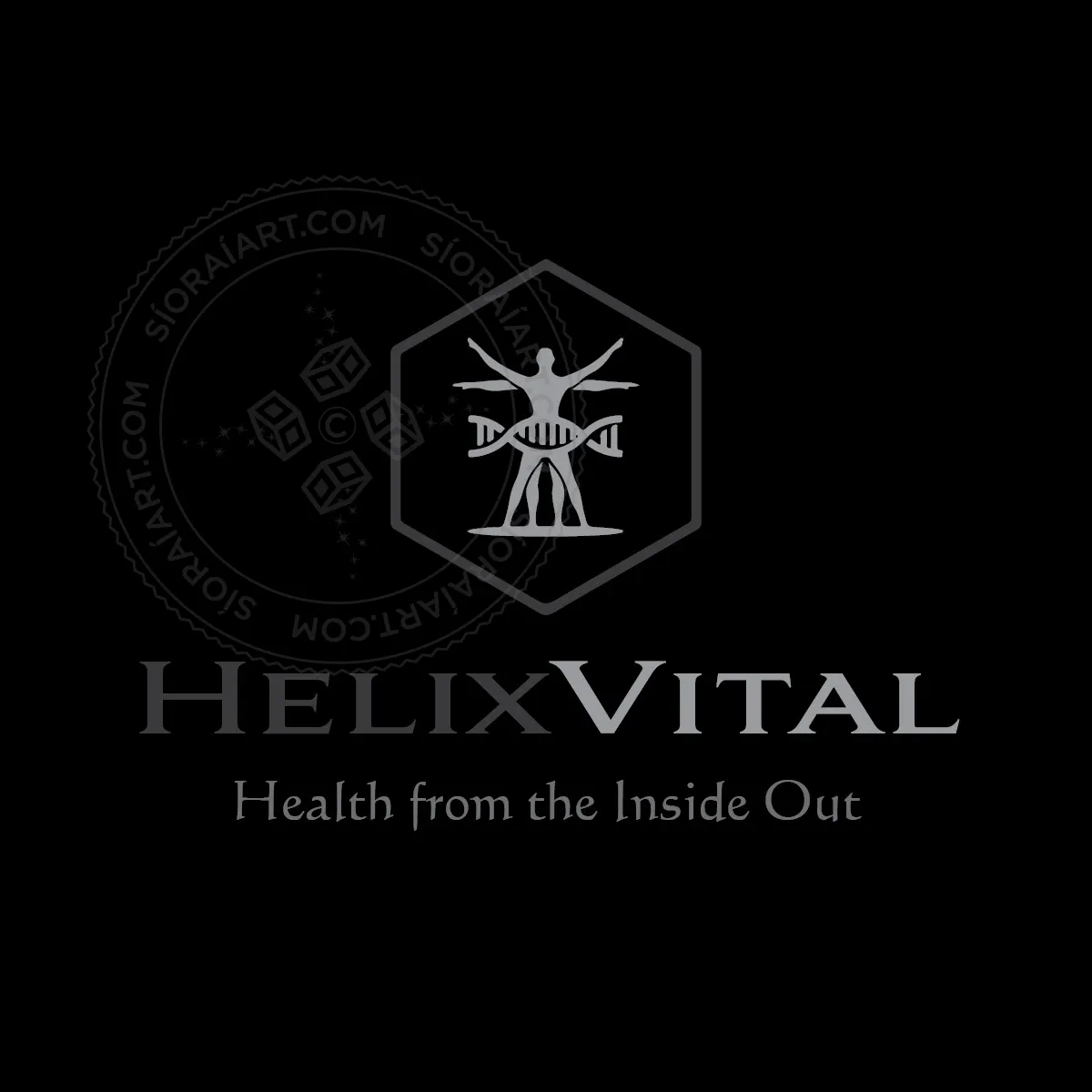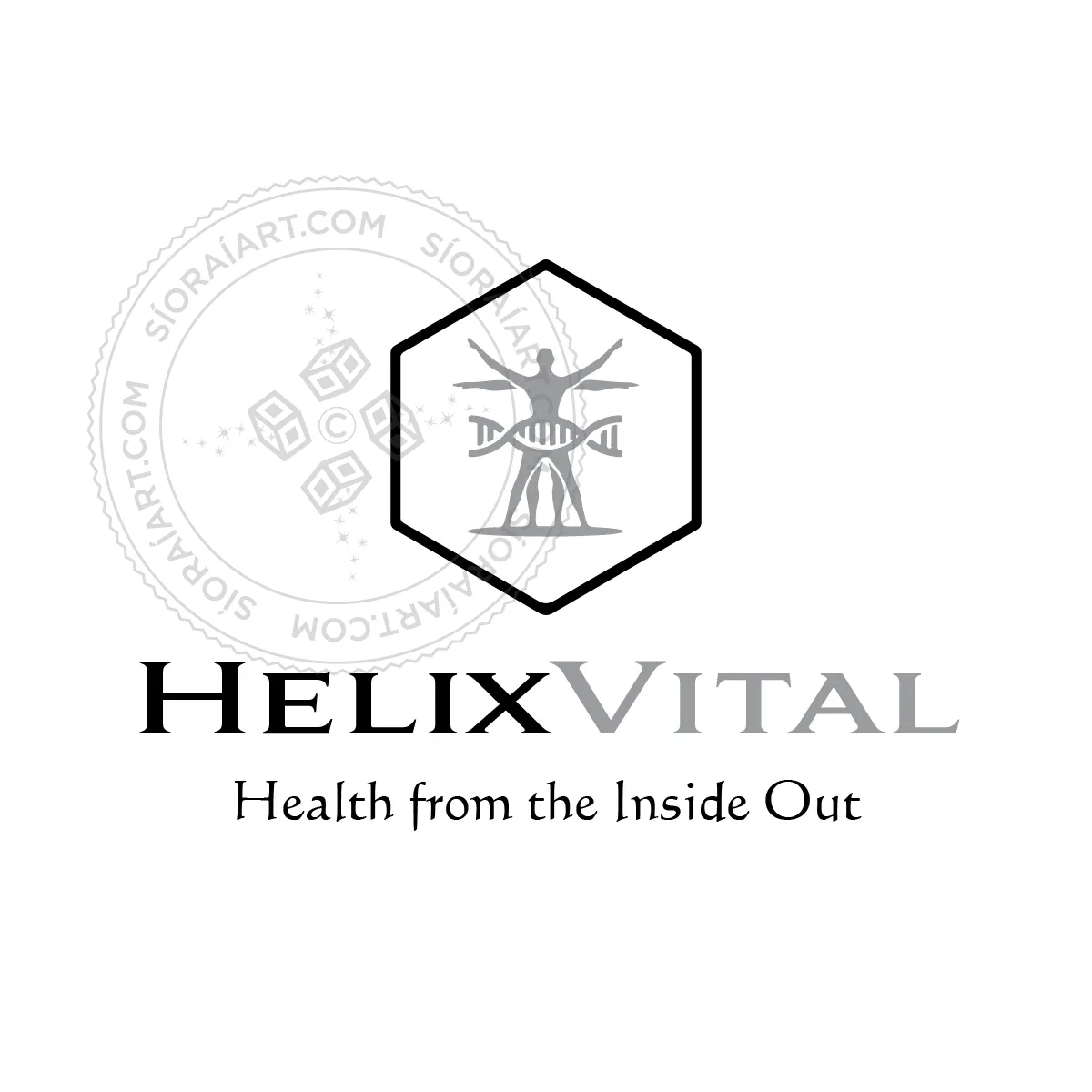 This emblem blends the universal symbol of human anatomy with the essence of genetic science. The Vitruvian-style figure speaks to balance and wellness, while the embedded DNA strand emphasizes a foundation in biotechnology or precision health. The hexagon reinforces a scientific framework, ideal for companies in genomics, health diagnostics, bio-research, or personalized medicine.