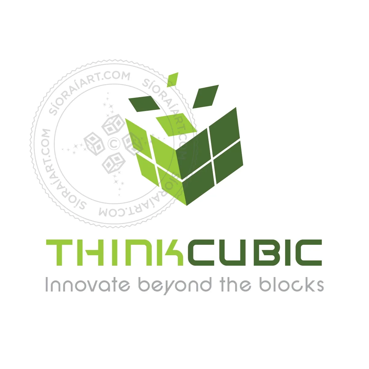 This logo presents a dynamic, geometric cube composed of green tiles, with several tiles seemingly breaking away and floating upward. The cube design symbolizes structure, innovation, and problem-solving, while the varying shades of green represent growth, sustainability, and adaptability. The disassembling top adds a creative twist, suggesting ideas breaking out of the box, forward-thinking solutions, or transformation through technology or nature.