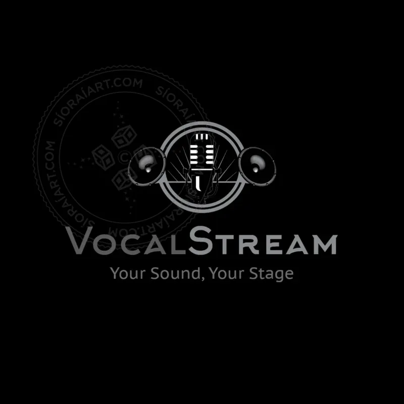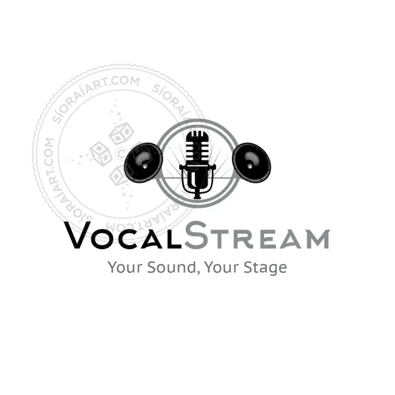 This logo features a vintage-style microphone at the center, flanked by two realistic speaker designs and encased within a circular frame with blue accents. The radiating lines behind the mic suggest sound waves, broadcasting, and communication. The use of black, gray, and blue tones adds a professional, modern, and high-energy feel, making it ideal for brands in podcasting, radio stations, music production, live streaming, or entertainment businesses.
